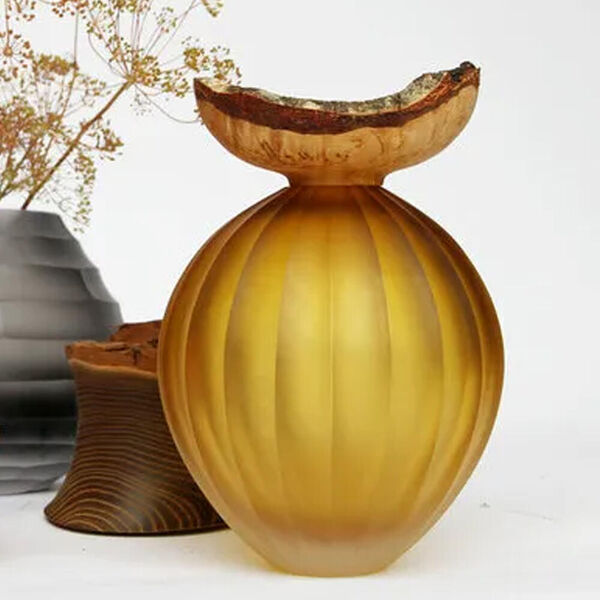 Het glas wordt op traditionele wijze mond geblazen in het Verenigd Koninkrijk, zonder gebruik van een mal. Hierdoor ontstaat een zachte, bolvormige contour die de natuurlijke elegantie van het materiaal benadrukt. De houten bovenkant, gemaakt van een boomtak, wordt zorgvuldig geselecteerd, met de hand gevormd en naadloos passend gemaakt in de werkplaats in Noord-Duitsland.